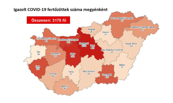 Az oldal térképe alapján továbbra is Budapesten (1552 ember) és Pest megyében (420) van a legtöbb fertőzött. Ezt követi Fejér megye (312), Komárom-Esztergom megye (162), Zala megye (151) és Csongrád megye (105). Vas megyében (14) van a legkevesebb fertőzött Magyarországon.