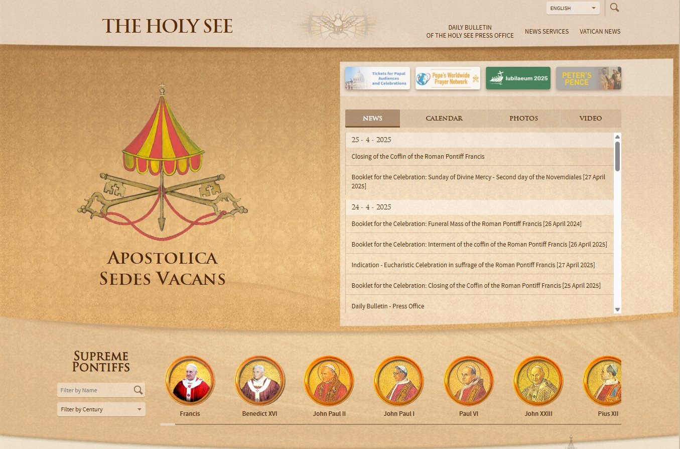 Fotó: A Vatikán nyitóoldalának képernyőképe (2025. április 25., 22.05)