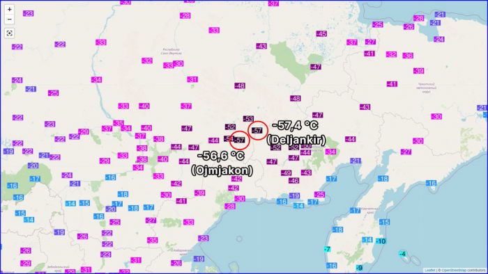 Rendkívül hideg, fagyos légtömeg uralja Szibéria keleti részét, ahol több helyen -30, -40 fok alatt alakul a hőmérséklet, és nemcsak éjszaka, hanem napközben is. Az északi félteke leghidegebb pontjaként számontartott Ojmjakonban is dermesztő hideg uralkodik. Hétfő hajnalban -56,6 fokig zuhant a hőmérséklet, napközben pedig mindössze -53,8 fok volt a maximum. Ennél is hidegebbet mértek az Ojmjakontól nem messze lévő Deljankirban, ahol -57,4 fok volt hétfő hajnalban.