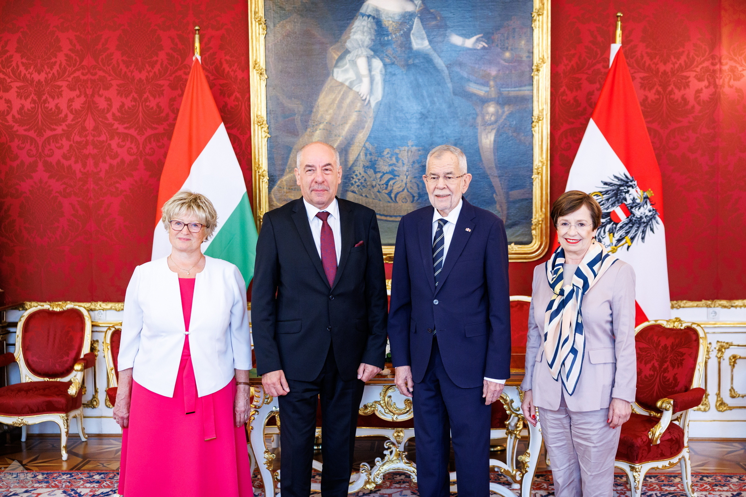 Nyitókép: Bécs, 2024. július 3. A Sándor-palota által közreadott képen Alexander Van der Bellen osztrák elnök (j2) és felesége, Doris Schmidauer (j) fogadja Sulyok Tamás köztársasági elnököt (b2) és feleségét, Nagy Zsuzsannát (b) a bécsi államfői rezidencián, a Hofburgban 2024. július 3-án. MTI/Sándor-palota