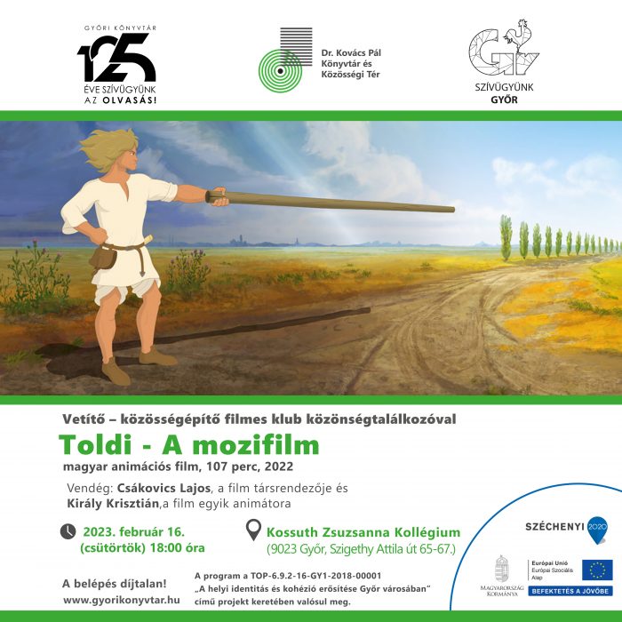2023. február 16-án (csütörtökön) 18 órakor a Dr. Kovács Pál Könyvtár és Közösségi Tér Vetítő filmklubjában a Toldi című magyar animációs filmet tekinthetik meg a Kossuth Zsuzsanna Kollégiumban (Győr, Szigethy Attila út 65-67.). A vetítést közönségtalálkozó követi.
