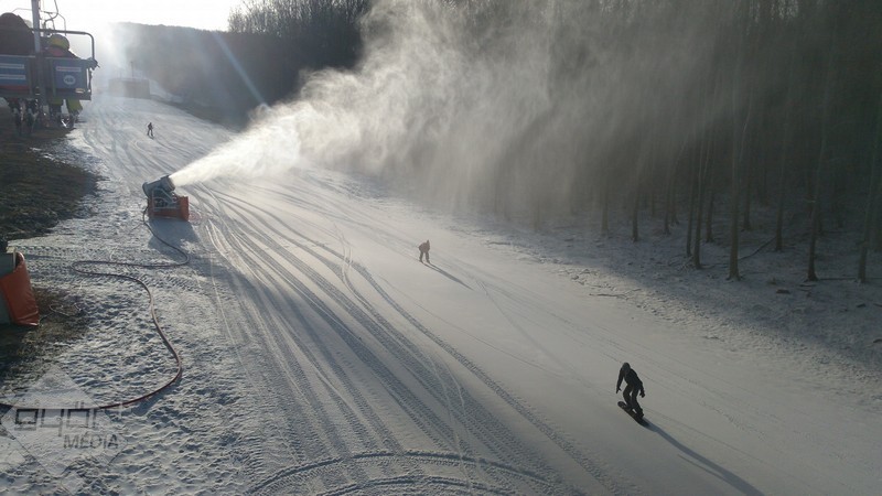 „Negyvenkilenc hóágyúnk van, ezekkel az idei télen eddig 170 ezer köbméter havat gyártottunk” – magyarázza László Márk. Műhóban kevésbé járatosak számára hozzáfűzi, hogy a technikai hó, ahogy ők nevezik, sokkal nehezebben olvad, mint a természetes hó.