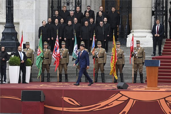 Katonai tiszteletadás mellett, Áder János államfő jelenlétében felvonták Magyarország nemzeti lobogóját az augusztus 20-ai állami ünnepen, péntek reggel Budapesten, az Országház előtti Kossuth Lajos téren.