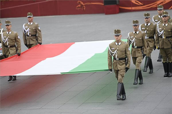Katonai tiszteletadás mellett, Áder János államfő jelenlétében felvonták Magyarország nemzeti lobogóját az augusztus 20-ai állami ünnepen, péntek reggel Budapesten, az Országház előtti Kossuth Lajos téren.
