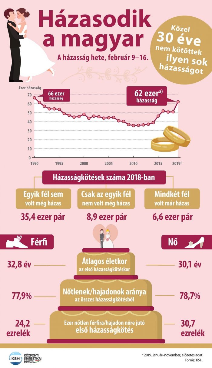 A Központi Statisztikai Hivatal (KSH) legfrissebb előzetes adatai szerint hazánkban „esküvőboom” volt tavaly: szeptember végéig többen kötötték össze életüket, mint 2018-ban az egész évben, ami soha nem látott emelkedés az elmúlt három évtizedben. Februárban ünneplik Magyarországon A házasság hetét.