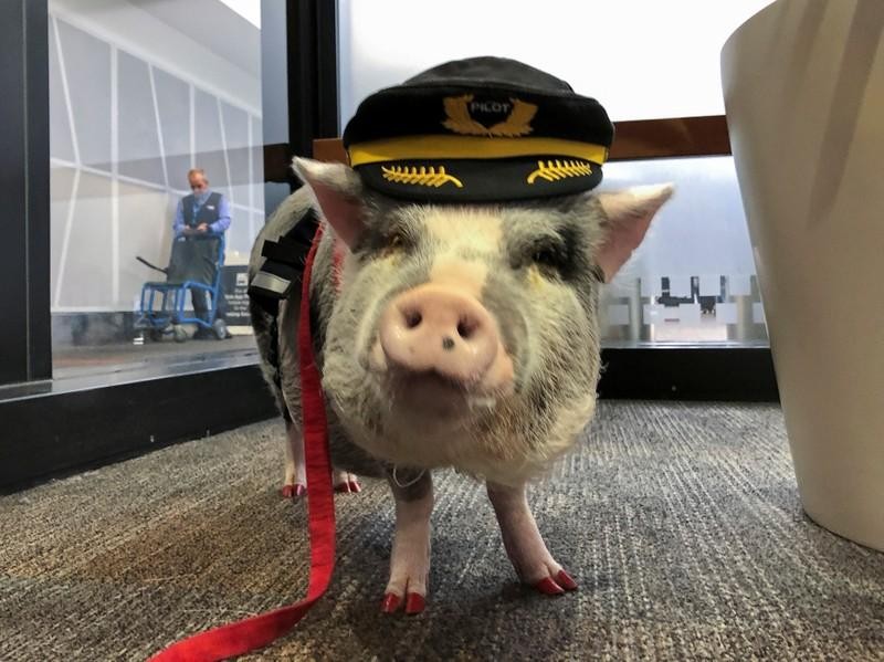 A terápiás állatok megszokottak sok amerikai repülőtéren, igaz, elsősorban kutyákat “foglalkoztatnak” e célokra. De a sertések sem teljesen szokatlanok. New York állam fővárosa, Albany nemzetközi légikikötőjében például 2016 decemberétől ugyancsak terápiás állatként kocog Szalonna, a koca.