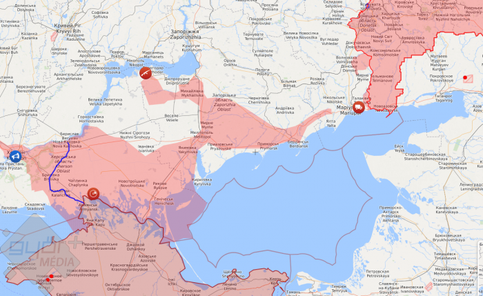 A liveuamap.com grafikáján is láthatóak az irányok: a vörössel jelölt területek a jelenleg orosz megszállás alatt álló részek, a vörös vonallal körülhatárolt rész a Krím a kép alján, míg jobb oldalt a Donyecki Népköztársasági szakadárok területe látható. Közöttük Mariupol városa, amely egyelőre kitart.
