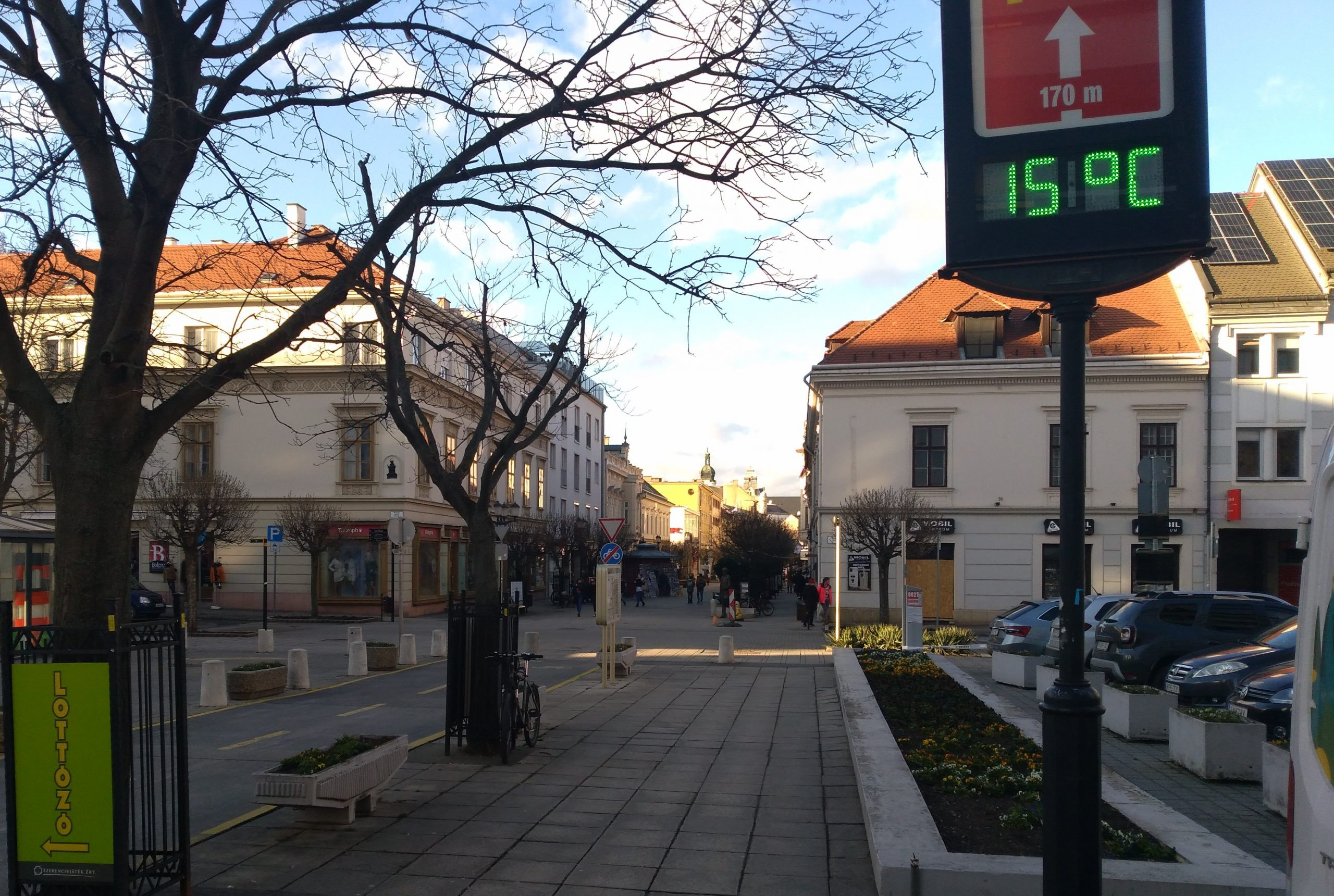 Ma Győrben ugyancsak kimondottan tavaszias idő volt. Amint az délután készült fotónkon is jól látható, a Baross utcánál 15 fokot jelezett a köztéri hőmérsékletet mutató oszlop.