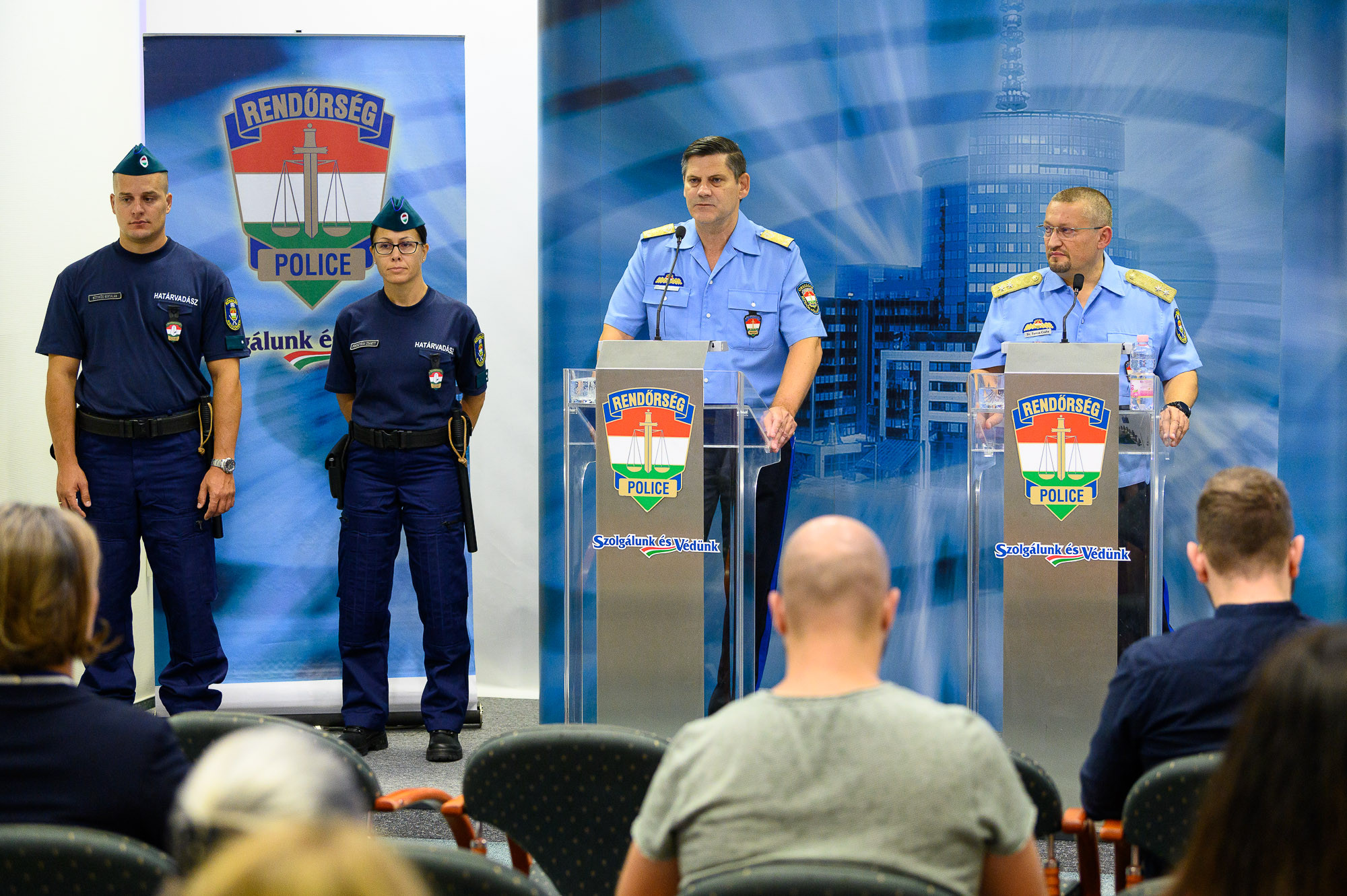 Dr. Tarcsa Csaba rendőr vezérőrnagy, műveleti országos rendőrfőkapitány-helyettes, a Készenléti Rendőrség parancsnoka, valamint dr. Pozsgai Zsolt rendőr vezérőrnagy, személyügyi országos rendőrfőkapitány-helyettes ismertette a Készenléti Rendőrség Határvadász Ezred szervezeti felépítését, tevékenységi körét, a szolgálatellátás helyszíneit, illetve a szerződéses határvadászok toborzásával kapcsolatos tudnivalókat 2022. július 15-én, a Rendőrségi Igazgatási Központ sajtótermében.