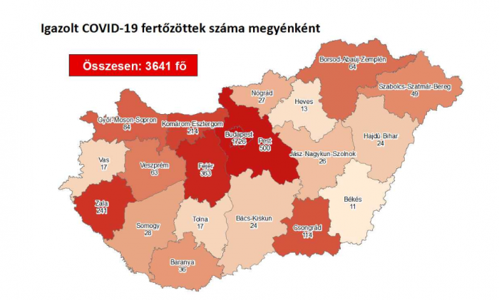 Az oldal térképe alapján továbbra is Budapesten (1726 ember) és Pest megyében (500) van a legtöbb fertőzött. Ezt követi Fejér (363), Zala (241), Komárom-Esztergom (214) és Csongrád megye (114). Békés megyében (11) van a legkevesebb fertőzött Magyarországon.