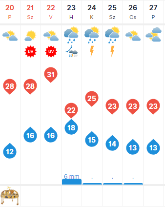 Hétfőn a Dunántúl nagy részén és északon már csapadékosabb, szelesebb lehet az idő egy hidegfront hatására, zivatarok is kialakulhatnak, és a csúcshőmérséklet is csak 21 és 27 fok között valószínű ezeken a tájakon. Máshol viszont még többórás napsütésre, 29-34 fokos maximumokra van kilátás. Éjjel a középső, a keleti és a déli tájakra is megérkeznek a záporok, zivatarok.