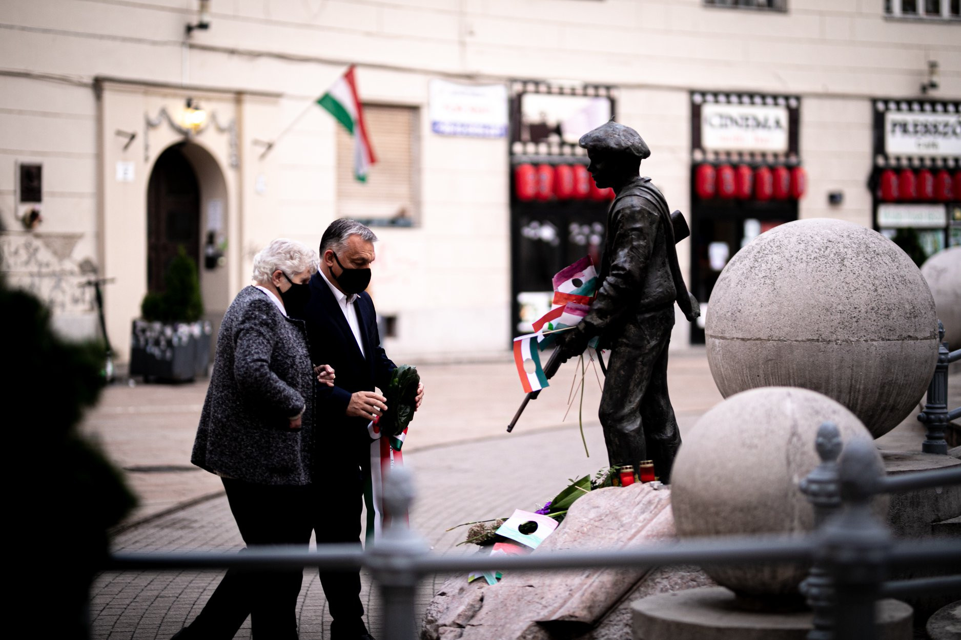 A Facebookon közzétett videóban az látható, hogy a kormányfő és Wittner Mária egy Gloria Victis 1956 feliratú, nemzeti színű szalaggal átkötött koszorút helyez el a 64 évvel ezelőtti forradalom emblematikus budapesti helyszínén, a Corvin közben, az 56-os pesti srác emlékművénél.