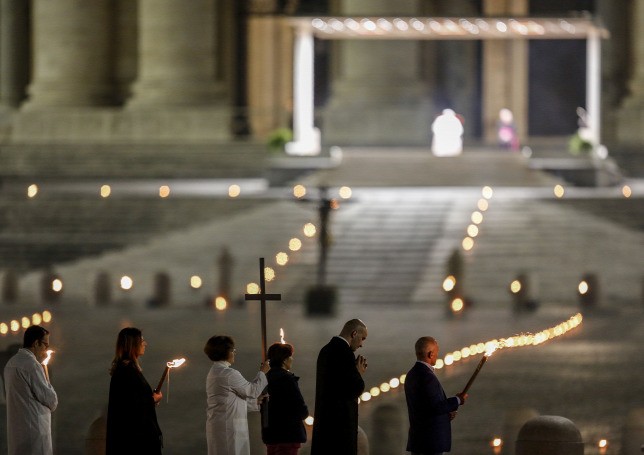 A Szent Péter tér közepén álló obeliszktől a Szent Péter-bazilikához vezető lépcsősor tetejéig haladt a római keresztút az idei nagypéntek este, amelyen a meditációk szövege a fizikai és lelki börtönbe zárt emberiséghez szólt a koronavírus-járvány miatt hívők nélküli téren.