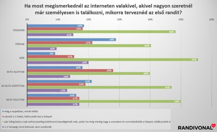 A közvélemény-kutatás keretében feltették a kérdést a randivonalon regisztrálóknak: „Ha most megismerkednél az interneten valakivel, akivel nagyon szeretnél személyesen is találkozni, mikorra terveznéd az első randit?” Összességében a válaszadók 19 százaléka mielőbb, akár a napokban, 18 százalékuk egy-két hetet várna, hátha jobb lesz a járványügyi helyzet, 48 százalékuk biztos, hogy várna legalább pár hetet, 15 százalékuk a következő egy-két hónapban biztosan nem randizna.
