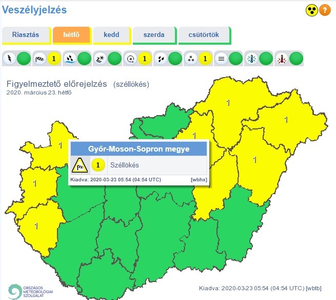 Az Országos Meteorológiai Szolgálat MTI-hez eljuttatott veszélyjelzésében azt írta: a középső országrészben hózáporokból kis területen eshet 1-2 centiméter hó. Szintén a kora reggeli óráktól kelet felől érkezik egy kiterjedtebb csapadéksáv (jobbára hó, de néhol havas eső, esetleg gyenge eső is előfordulhat – folyékony halmazállapot délelőttől lehetséges). Az ország északi felén legfeljebb lepelnyi réteg alakulhat ki, ám az ország déli felén akár 5, 6 centiméter tapadó hó eshet (nagyobb mennyiségre a Dél-Alföldön és Baranyában lehet számítani). A Mecsekben azonban, ahol jobbára porhó valószínű, a viharos északkeleti szél hófúvást okozhat (főként estétől). Győr-Moson-Sopron megyében többnyire száraz, napos, de hideg idő valószínű hétfőn. Az erős szél miatt figyelmeztetés érvényes.