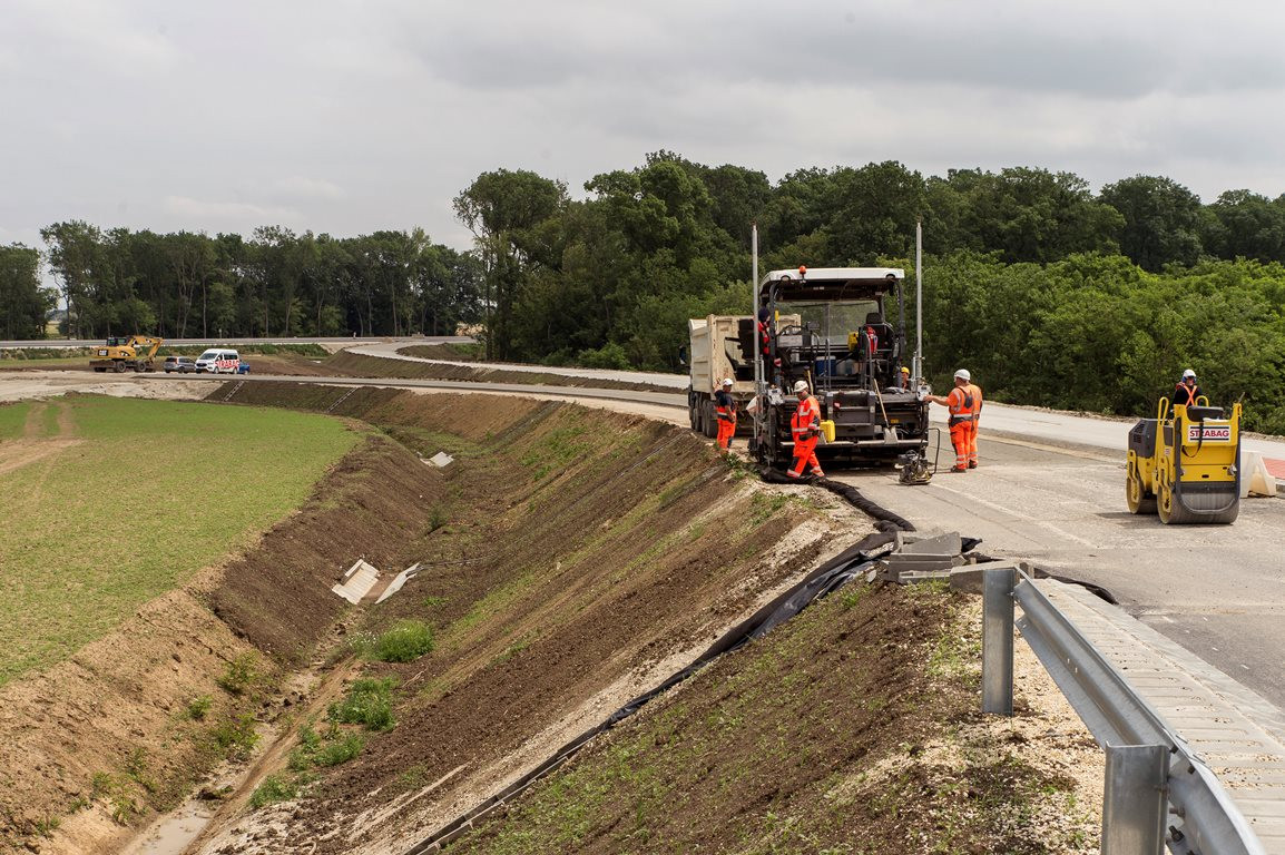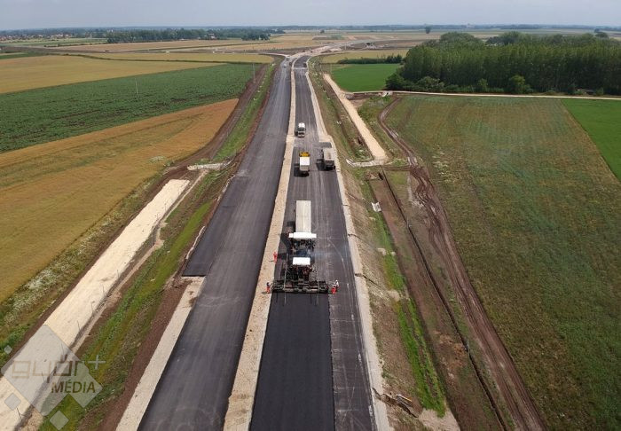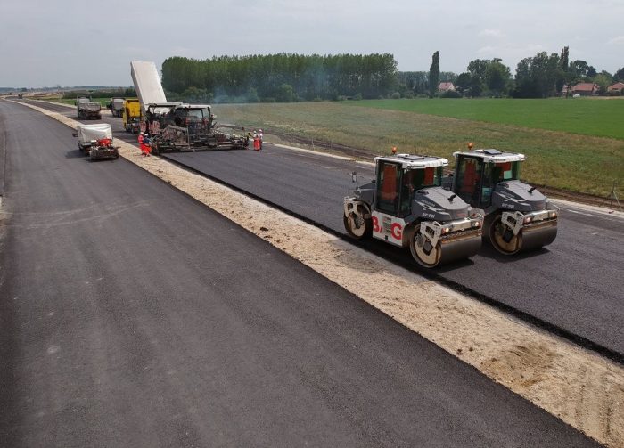 Aszfaltterítő gép az M85-ös kétszer kétsávos gyorsforgalmi úton