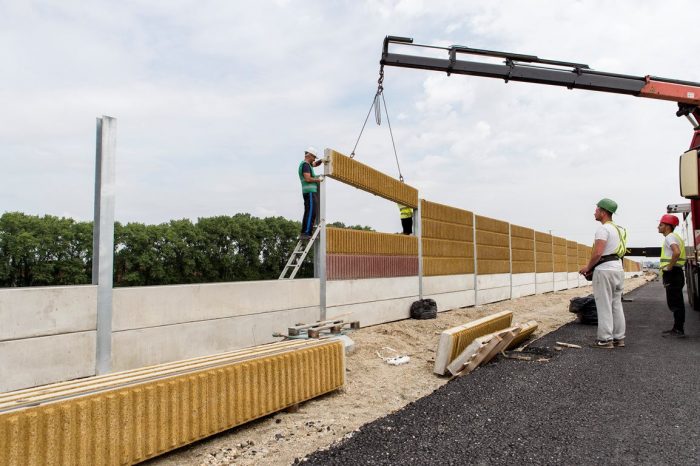 Zajvédő elemet emelnek be a munkások a gyorsforgalmi út mellett