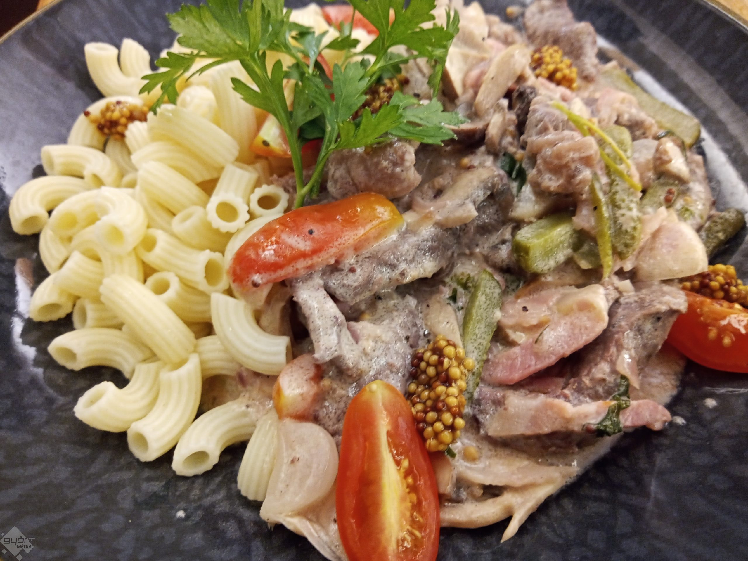 A Panírban ennek az ételnek a klasszikus változatát mutatjuk meg, így a tejszínes, gombás, uborkás, gyöngyhagymás szószba pácolt marhahús kerül.