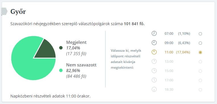 Délelőtt 11 óráig a választásra jogosult 101 841 győri választópolgárból 17 355-en szavaztak az önkormányzati választásokon, ami 17,04 százalékos részvételt jelent.