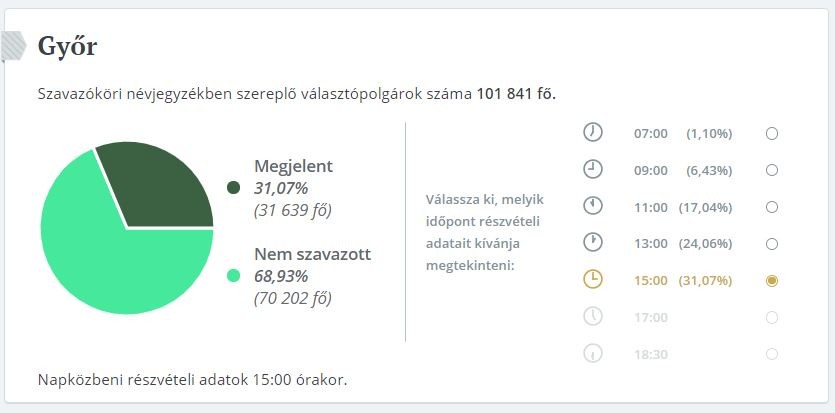 Délután 15 óráig a választásra jogosult 101841 győri választópolgárból 31639-en szavaztak az önkormányzati választásokon, ami 31,07 százalékos részvételt jelent.