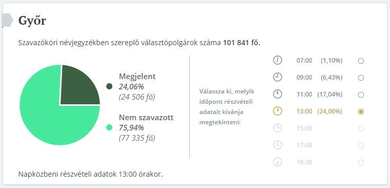Délután 13 óráig a választásra jogosult 101 841 győri választópolgárból 24 506-an szavaztak az önkormányzati választásokon, ami 24,06 százalékos részvételt jelent.