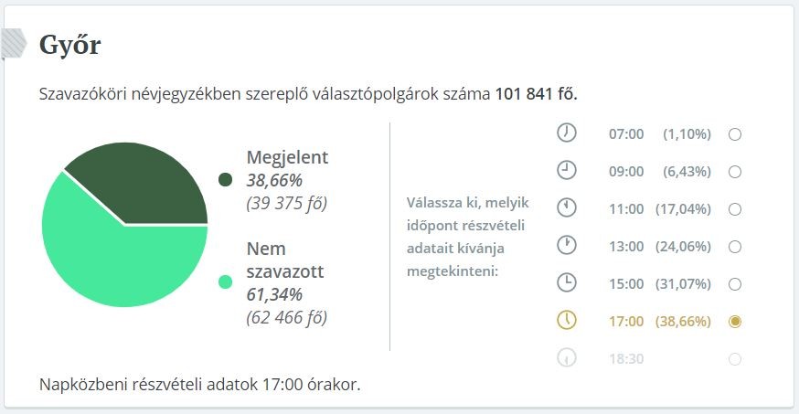 Délután 17 óráig a választásra jogosult 101 841 győri választópolgárból 39 375-en szavaztak az önkormányzati választásokon, ami 38,66 százalékos részvételt jelent.