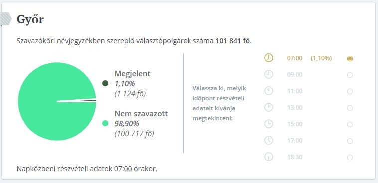 Győrben reggel 7 óráig a választásra jogosult 101841 győri választópolgárból 1124-en szavaztak az önkormányzati választásokon, ami 1,1 százalékos részvételt jelent.