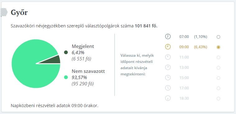 Délelőtt 9 óráig a választásra jogosult 101 841 győri választópolgárból 6 551-en szavaztak az önkormányzati választásokon, ami 6,43 százalékos részvételt jelent.