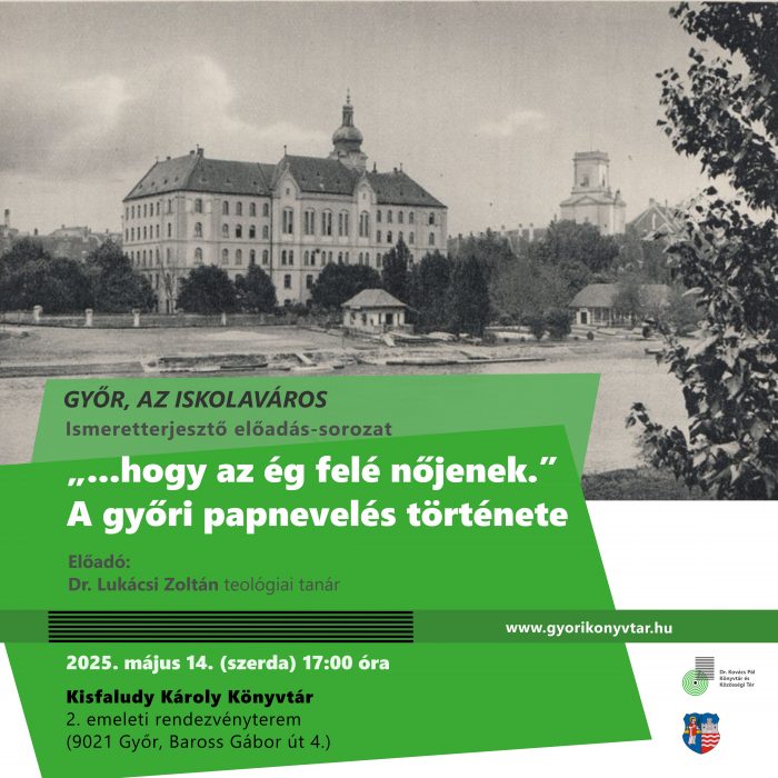 Május 14-én (szerda) 17 órakor a Kisfaludy Károly Könyvtár 2. emeleti rendezvénytermében (9021 Győr, Baross Gábor út 4.) Győr, az iskolaváros sorozat keretén belül „..hogy az ég felé nőjenek. ” címmel a győri papnevelés történetét hallhatják az érdeklődők.