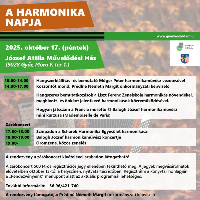 – 10-14 óra: Hangszerkiállítás- és bemutató Móger Péter harmonikaművész vezetésével