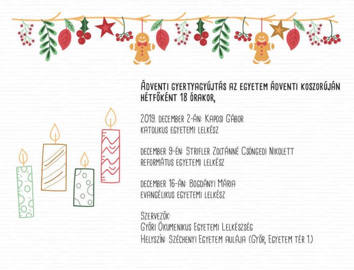 December 11-én: Bogdányi Mária evangélikus egyetemi lelkész várja a hallgatókat a Széchenyi István Egyetem aulájában (Egyetem tér 1.).
