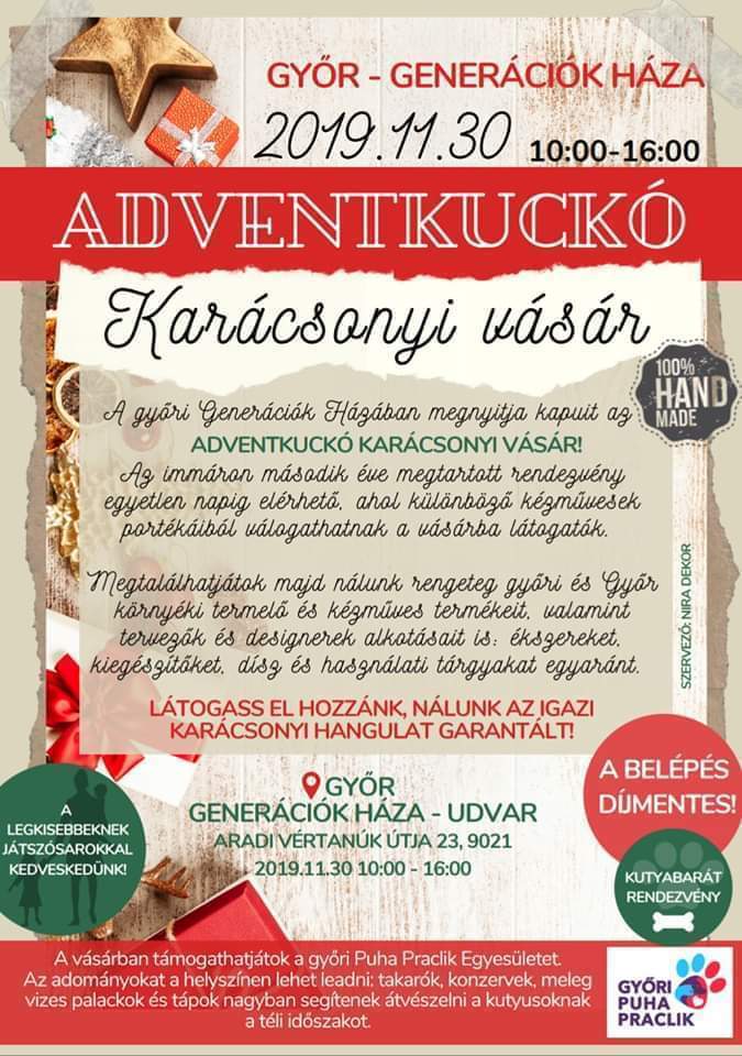 A Generációk Házában ( Győr, Aradi vértanúk útja 23. november 30-án 10 órákor nyitja meg kapuját az adventkuckó, ahol különböző győri kézművesek designerek portékáiból válogathatnak a vásárba látogatók.