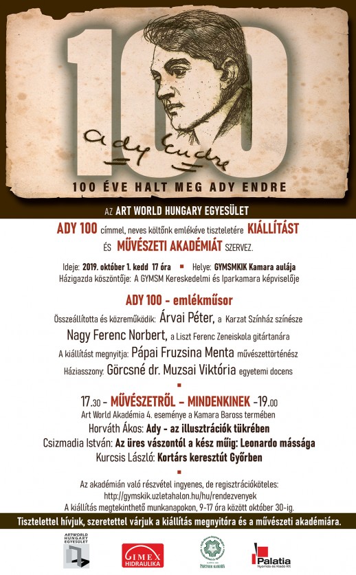 Az Art World Hungary Egyesület ADY 100 címmel neves költőnk emlékévének tiszteletére kiállítást és művészeti akadémiát szervez.