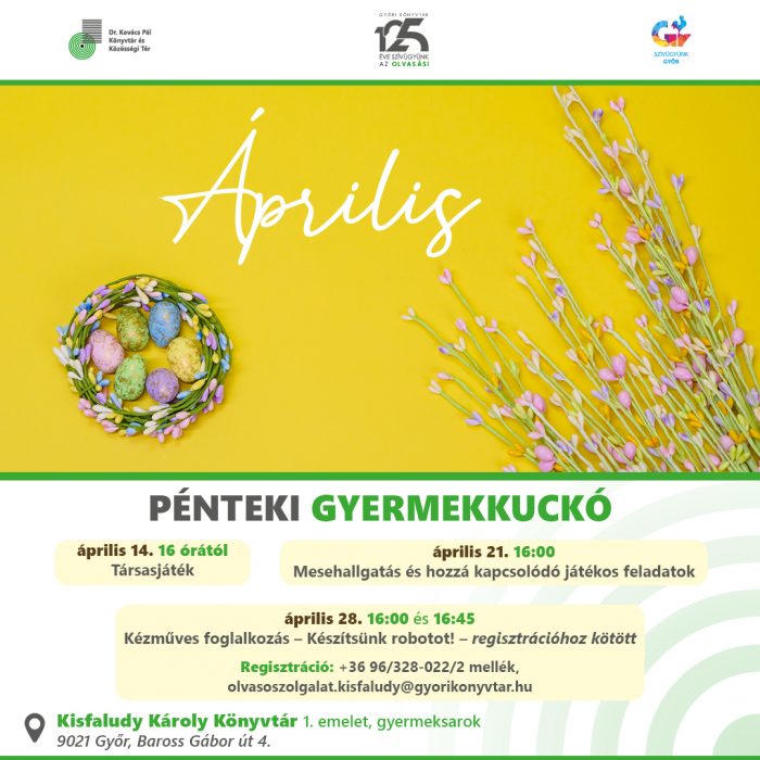 A Dr. Kovács Pál Könyvtár és Közösségi Tér Kisfaludy Károly Könyvtára Gyermekkuckó részén (Győr, Baross u. 4., I. emelet) péntekenként gyermekprogramokkal várják az érdeklődőket. Kövessék a rózsaszínű pöttyöket! Minden rendezvény díjtalan. Figyeljék a regisztrációra vonatkozó információkat!