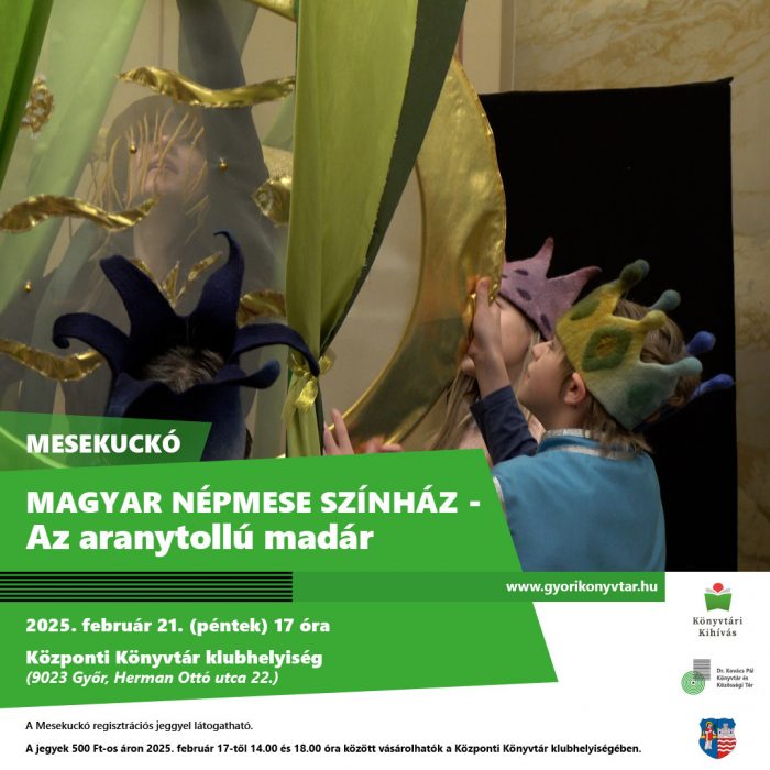 2025. február 21-én (péntek) 17 órától a Központi Könyvtár klubhelyiségében (9023 Győr, Herman Ottó utca 22.) Mesekuckónk keretén belül a Magyar Népmese Színház Az aranytollú madár című előadását láthatják.