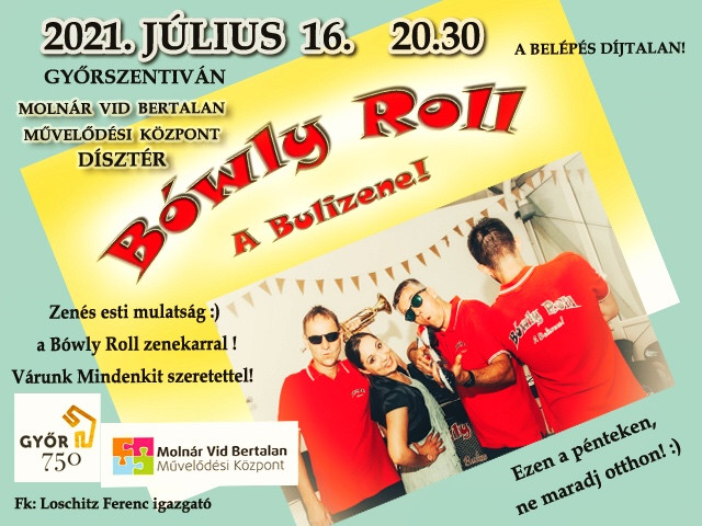 A Bówly Roll buli zenekar pénteken 20.30 órától zenés, nyáresti, könnyed bulizásra várja a szórakozni vágyókat Győrszentivánon, a Molnár Vid Bertalan Művelődési Központ díszterén!