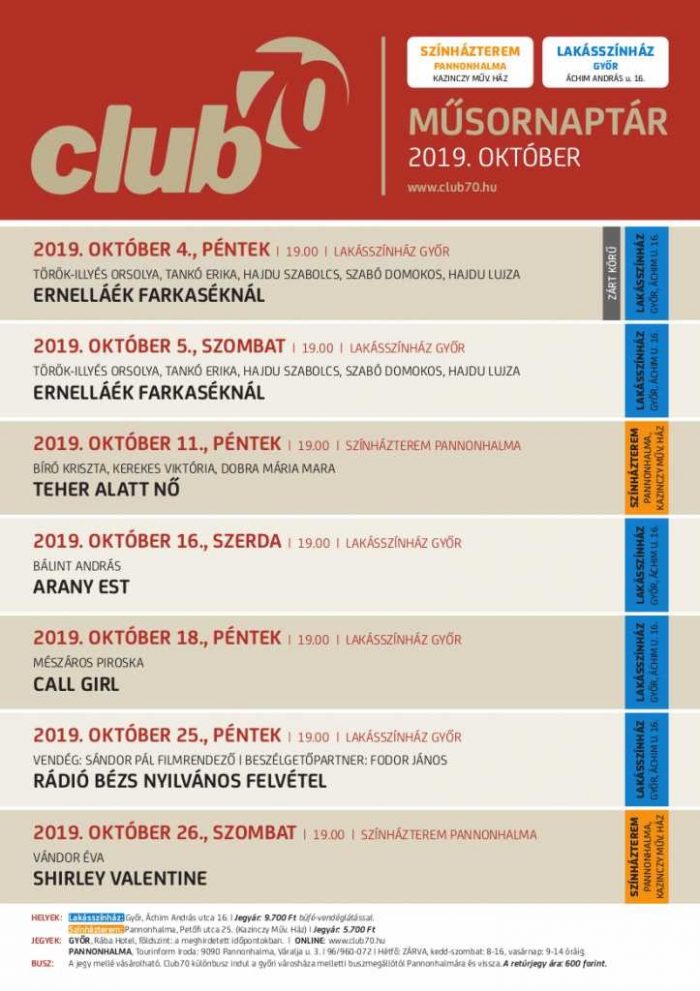 Gáti Oszkár színművész által szervezett Club70 színházi estek tovább folytatódnak október hónapban is. Az alábbiakban megtalálja a győri és pannonhalmi előadások időpontjait, és előadásait.
