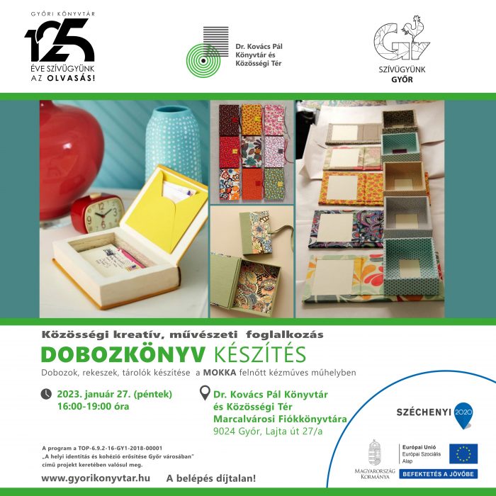 2023. január 27-én (pénteken) 16-tól 19 óráig dobozokat, rekeszeket, tárolókat készíthetnek a MOKKA felnőtt kézműves műhelyben a Dr. Kovács Pál Könyvtár és Közösségi Tér Marcalvárosi Fiókkönyvtárában (Győr, Lajta út 27/a.). A hozzávalókat a szervezők biztosítják.