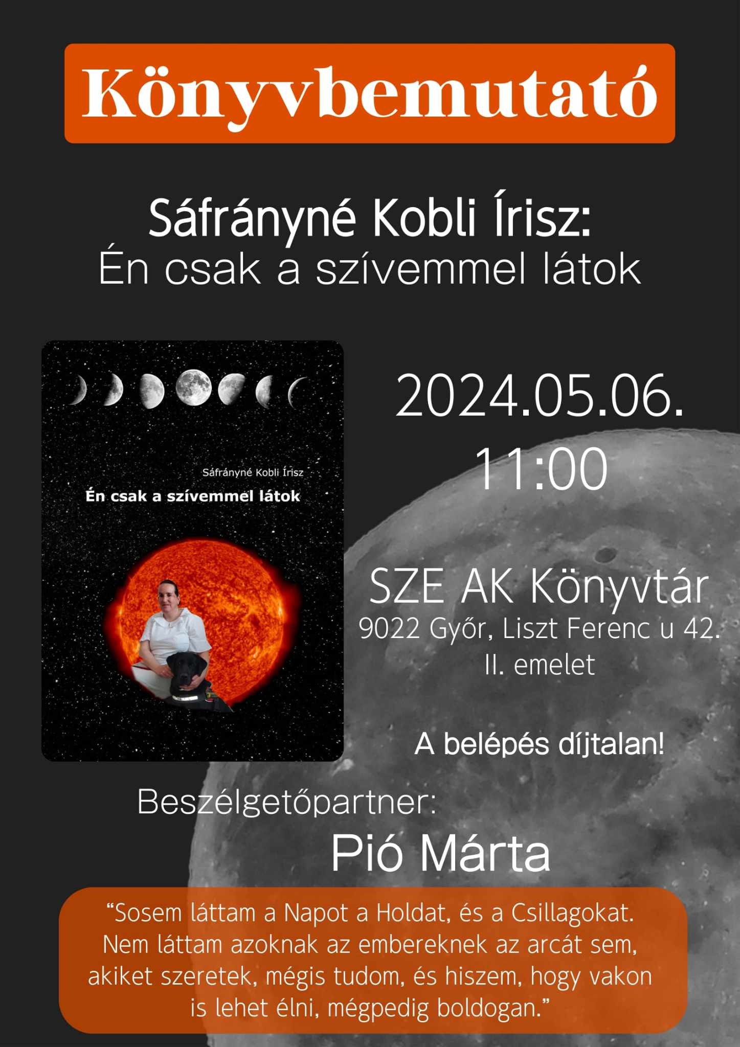 A látássérült győri szerzővel Pió Márta, a kötet szerkesztője beszélget május 6-án 11 órakor az Apáczai-karon. (Liszt Ferenc u. 42.).