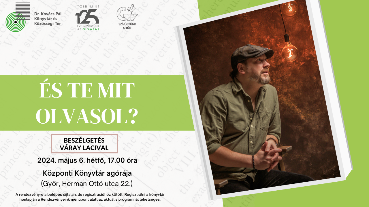 Váray Laci zenész, dalszerző, szövegíró. Munkásságáról a Magyar Napló egyszer így fogalmazott: “Laci dalszövegei olyanok, mint egy jólnevelt pitbull – kitépi a szívedet, de végül visszahozza”. Vajon annak, aki ilyen gondolatokat tud papírra vetni sokat kell olvasni? Erre a kérdésre is keressük majd a választ 2024. május 6-án (hétfő) 17 órától a Központi könyvtár agóráján (Felnőtt olvasószolgálat, 9023 Győr, Herman Ottó u. 22. ). Beszélgetőtársa Bajzát Zsuzsi lesz.