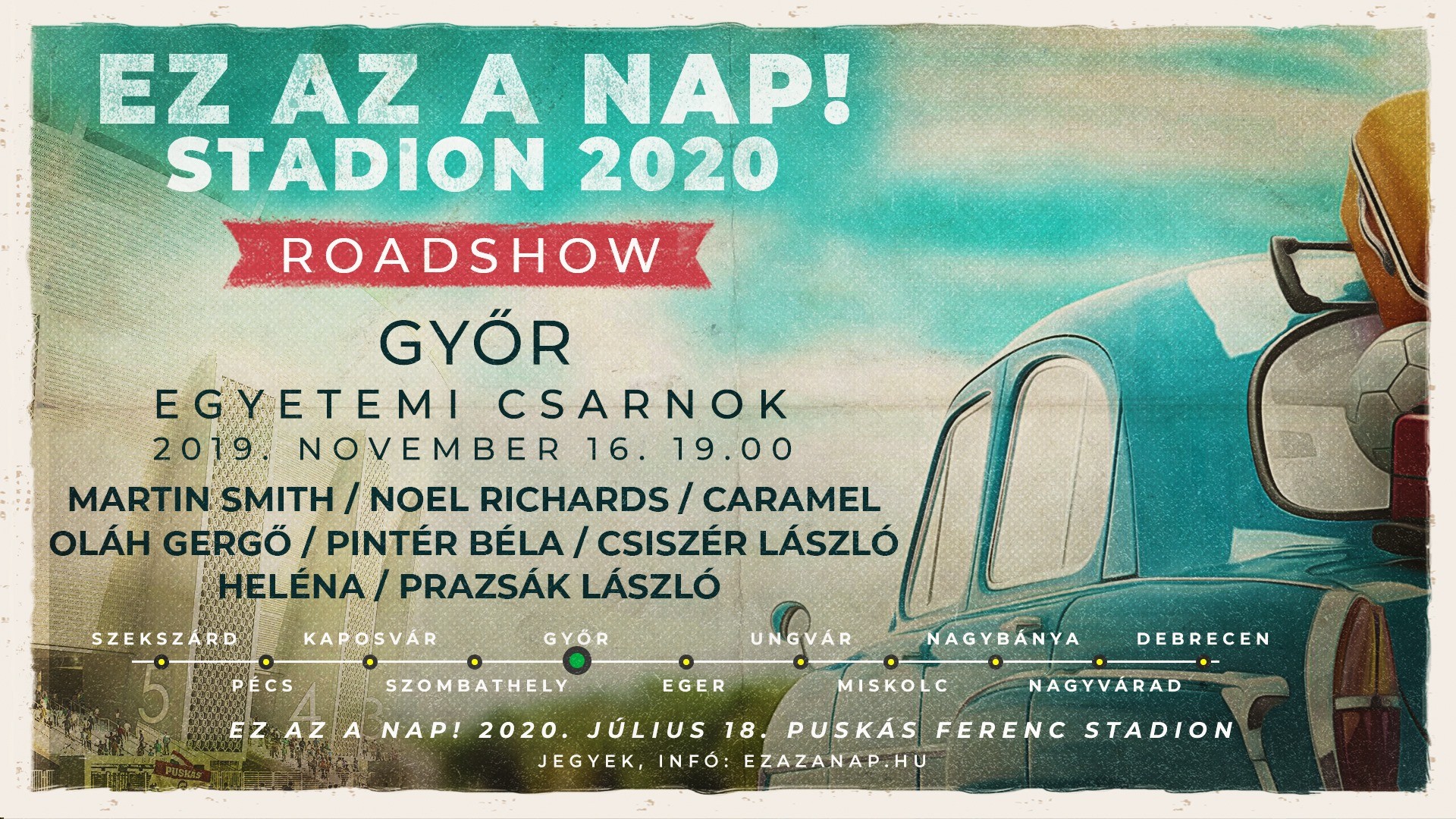 A 2020. július 18-i, Puskás Stadionban megrendezésre kerülő 20 éves jubileumi Ez az a nap!-ra hangolódva 2019. november 16-án a győri Egyetemi Csarnokban Ez az a nap! Roadshow-ra kerül sor! Célunk, hogy Istent dicsőítsük, hirdessük az evangéliumot és meghívjunk mindenkit a Stadionba.