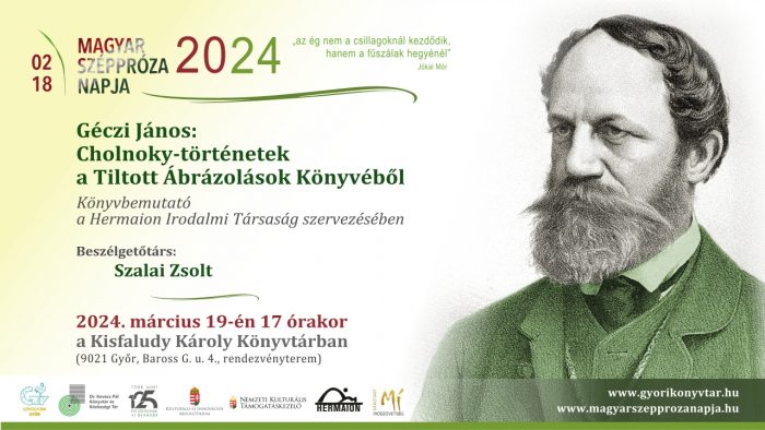 Március 19-én (kedd) 17 órakor a Kisfaludy Károly Könyvtár rendezvénytermében (9021 Győr, Baross G. u. 4.) a Magyar Széppróza Napja jegyében Géczi János: Cholnoky-történetek a Tiltott Ábrázolások Könyvéből című művének bemutatóján vehetnek részt a Hermaion Irodalmi Társaság szervezésében.