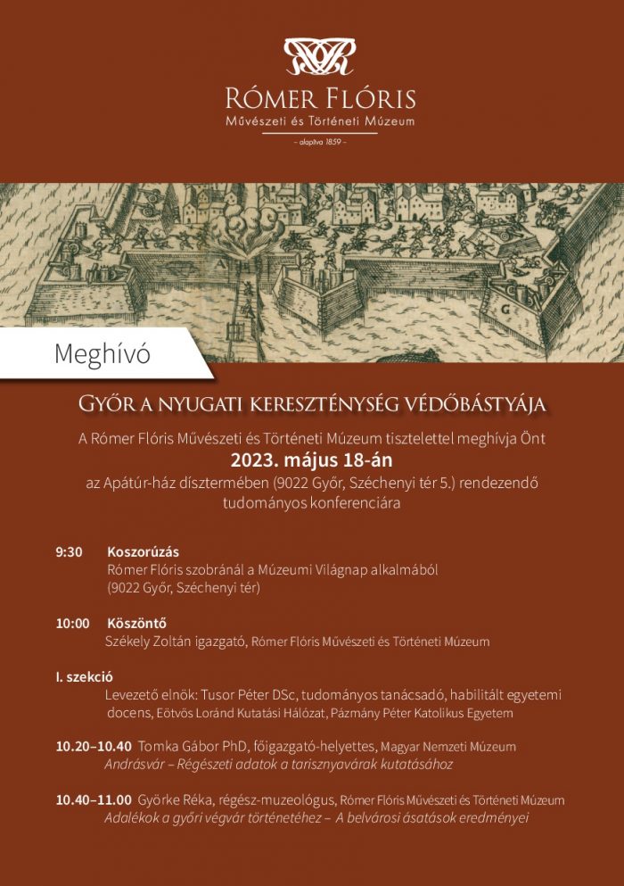 Győr 2023-ban ünnepli a vár töröktől való visszafoglalásának 425. évfordulóját. A Rómer Flóris Művészeti és Történeti Múzeum ez alkalomból tudományos konferenciát rendez az Apátúr-ház dísztermében, mely a Magyar Ispitában rendezett, „Megvesszük Győrt és bástyája mienk” – A végvár törökkori ostromai című, nagyszabású időszaki kiállításunk megnyitójával zárul. Az előadások egy része a végvár építéstörténetéhez, annak régészeti emlékeihez kapcsolódik a megerősítési munkálatok időszakától egészen a vár szerepének csökkenéséig. De hallhatunk az 1594–1598-as hadi eseményekről, vagy éppen a győri várat megörökítő 19. századi közköltészeti alkotásokról is.