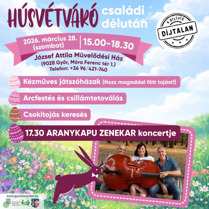 Március 28-án, 15-18.30 óra között kicsiket és nagyokat sok szeretettel várják Húsvétváró Családi Délutánra a József Attila Művelődési Házba (9028 Győr, Móra F. tér 1.).