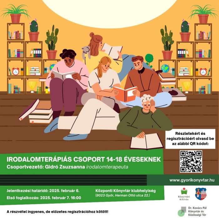 Február 7-én pénteken, Irodalomterápiás csoportot indítanak 16 órai kezdettel a Központi Könyvtár klubhelyiségében (9023, Győr Herman Ottó utca 22.) 14-18 évesek számára.