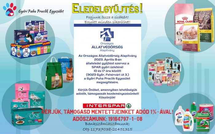 A következő eledelgyűjtés április 8-án lesz 10:00 – 17:00 óra között a megszokott helyen, a Fehérvári út 3. szám alatt lévő INTERSPAR-nál, ahol szívesen fogadnak jó minőségű felnőtt és junior száraz és nedves macskaeledelt, kutyapelenkát, Royal Canin cicatápszert, puha plüssöket, pokrócokat, tisztítószereket, és macskaalmot, amiből sosincs elég.
