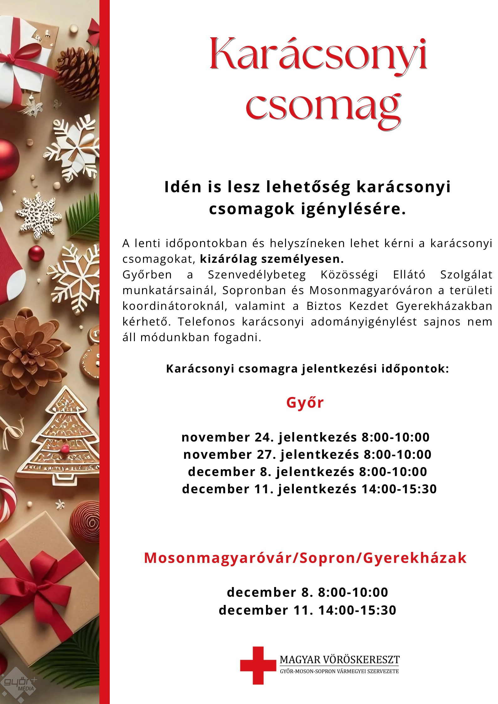 A lenti időpontokban és helyszíneken lehet kérni karácsonyi csomagokat, kizárólag személyesen.