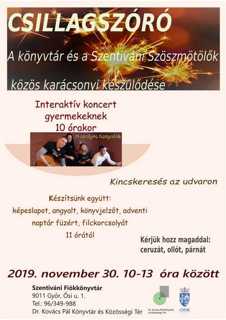 Interaktív gyermekkoncert, kincskeresés és kézműveskedés várja a látogatókat november 30-án (szombaton) 10 és 13 között a könyvtárban (Ősi u. 1.).