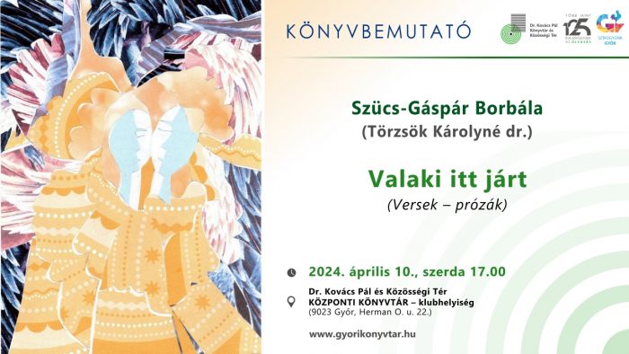2024. április 10-én (szerda) 17 órakor a Dr. Kovács Pál Könyvtár központi könyvtár – klubhelyiségében (9023 Győr, Herman O. u. 22.) Szücs-Gáspár Borbála (Törzsök Károlyné dr.) mutatja be Valaki itt járt (Versek – prózák) című kötetét.
