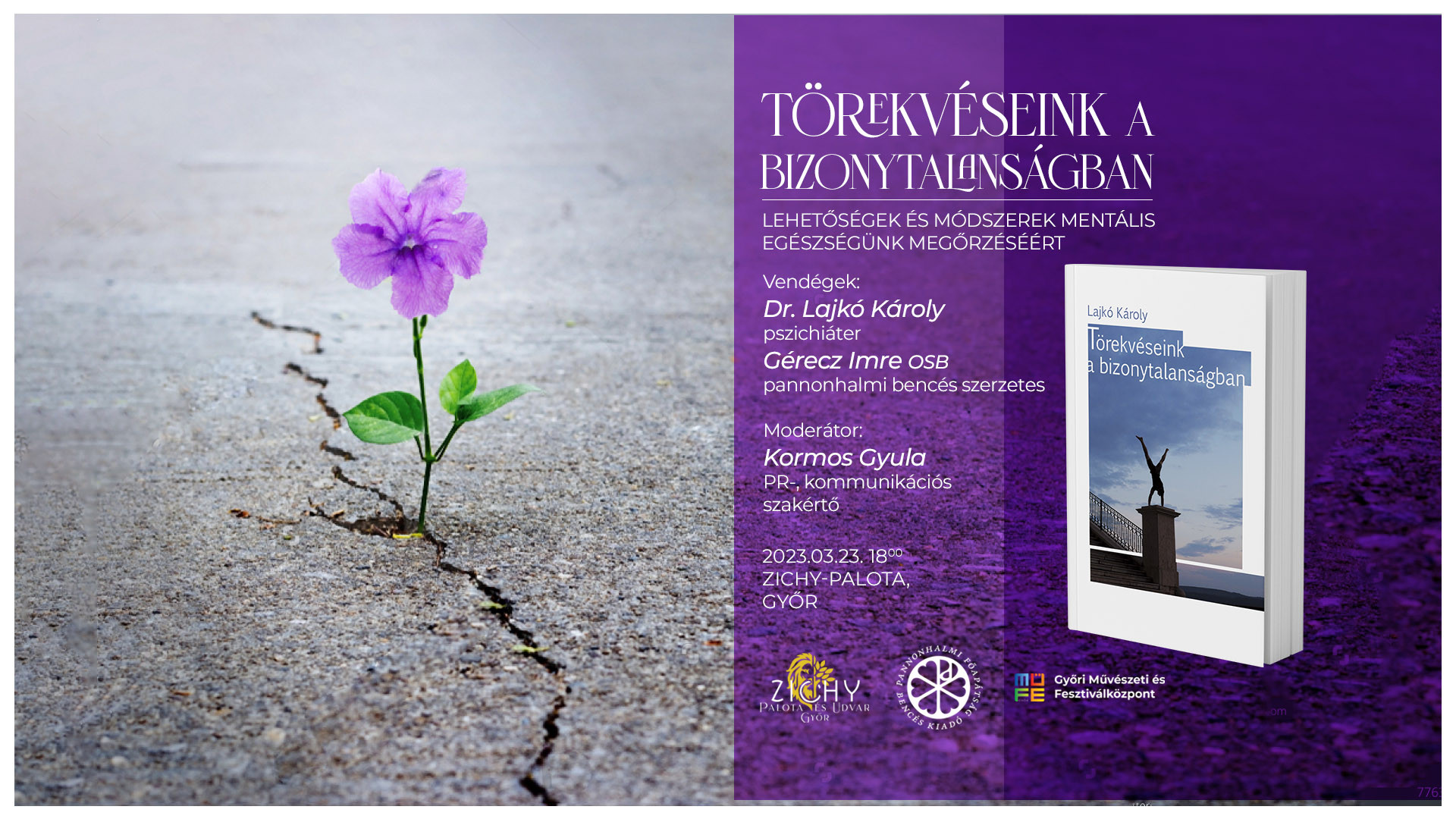 A március 23-án, este 18 órától kezdődő rendezvényen bemutatják Lajkó Károly – a Bencés kiadó gondozásában megjelent – legújabb kötetét is, Törekvéseink a bizonytalanságban címmel a a Győri Művészeti és Fesztiválközpontban.